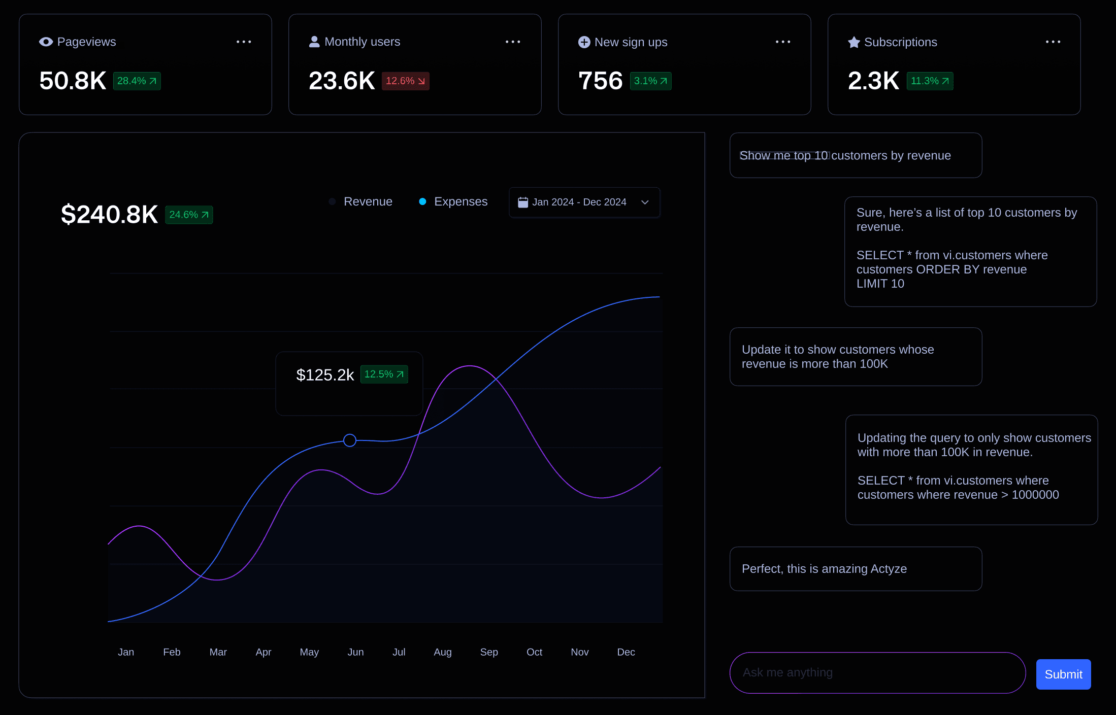 Actyze enables teams to query, explore, and act on data directly where it lives, using secure natural language and governed SQL.