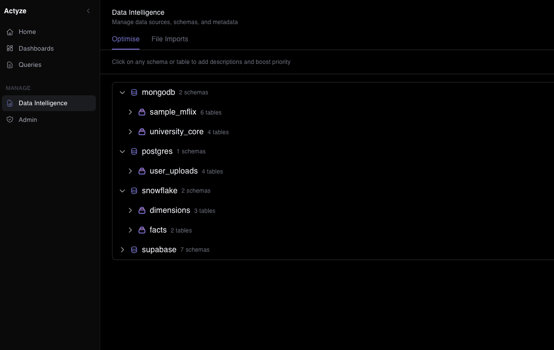 Enterprise data today is spread across warehouses, databases, and operational systems. Actyze is designed for this reality.